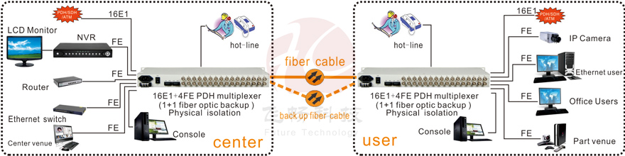 This series of equipment is the company developed the PDH fiber transmission dedicated VLSI developed on the basis of point to point optical transmission equipment. Provide 1 to 16 E1 interfaces primary and backup fiber optical interface connector 1-4 physical isolation 10M / 100M Fast Ethernet interface (independent four-speed route 100M) as well as two business expansion interface. 2 Extended service interface can be used as RS232 / RS485 / RS422 asynchronous data voice signal twenty-four wire E & M audio signals digital signals Ethernet signals (bandwidth 2M) and other transmission channel the application is very flexible. Optional one digital service telephone the application is very flexible. With a sound alarm function the whole stable reliable low power consumption high integration small size.