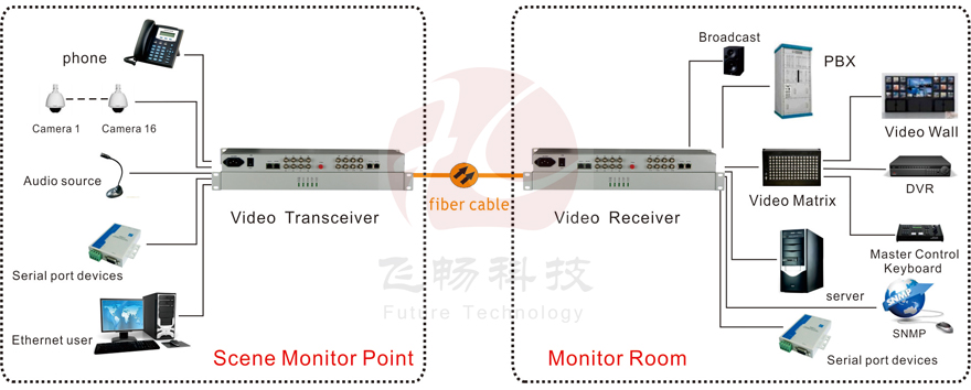 This digital video optical transceiver adopts digital video encoding and gigabit optical fiber transmission technology. The multi-channel single-direction bi-direction audio, video, data, telephone, Ethernet and switch real-time synchronization, no-distortion and high quality transmission is on the single-core or dual-core optical fiber. Complete digital video non-compression transmission technology, with video and data condition indicator, can monitor the system normal operation. It uses modular design, the user can flexibly select or customize configuration based on the scene occasion. Rack installation or desktop installation can be optional. This product is made up of optical transmitter and receiver. It can transmit simultaneously 16Channel forward direction video, audio, data, phone, E1, Ethernet and switch.