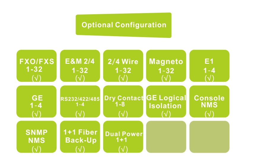 The Equipment provides 32*Voice, 1~4E1 interface, 4*10/100/1000M Gigabit Ethernet interface (Wire speed 1000M), and four extended service interfaces. 4*GE interface for the Switch port, can support VLAN division. 4 expansion service interface can be used as RS232/RS485/RS422 asynchronous data /TTL signal/Dry Contact signal and other transmission channels, the application is very flexible.