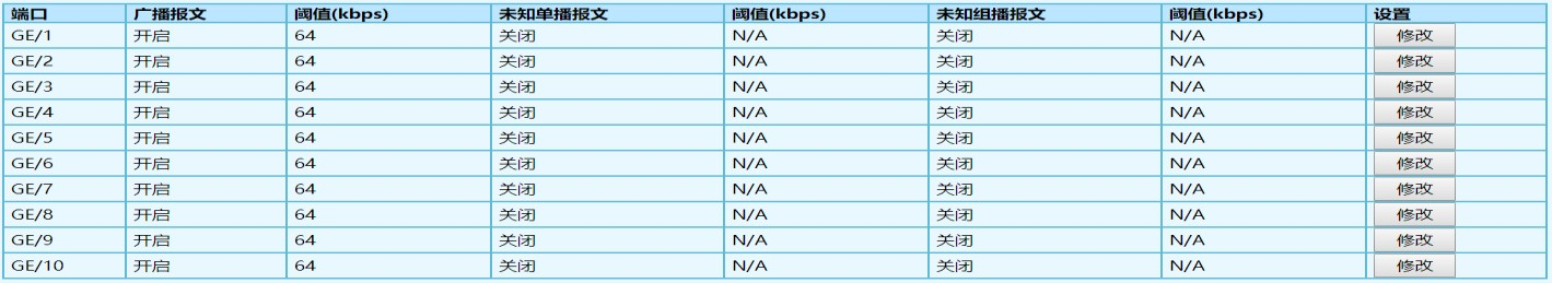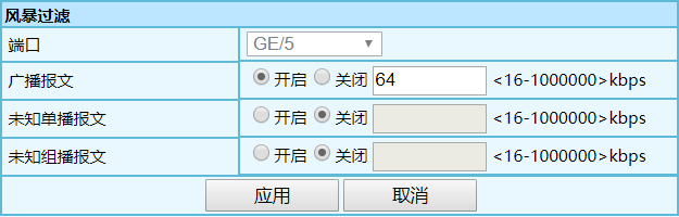 選擇是否開啟對廣播報文的速率抑制??赏ㄟ^單選按鈕進行選擇。 開啟 --如果選擇開啟,則要輸入相應的速率抑制值,<16-1000000>,歩 進為 16,單位為 kbps 關閉 |