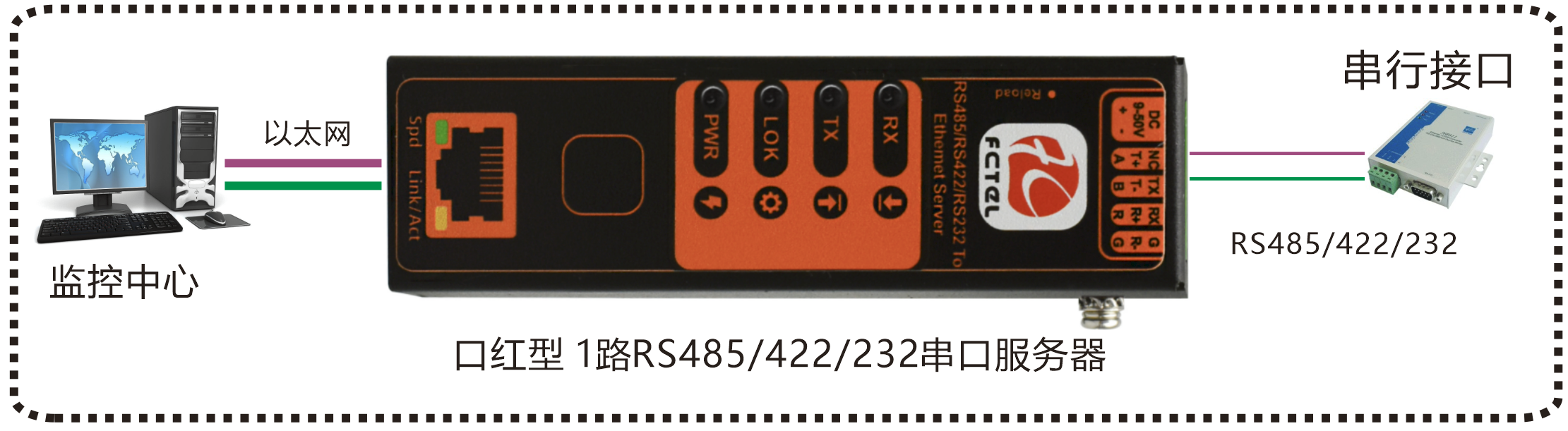 | 業(yè)務(wù)端口描述 | 1個RS485/RS422/RS232串行接口,1路百兆以太網(wǎng)電口 |