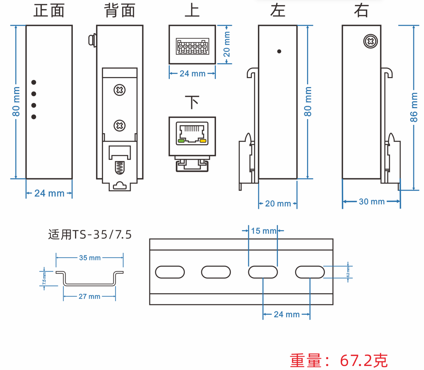 尺寸:24mm(長) x 80mm(寬) x 20mm(高) 安裝方式:35mm導(dǎo)軌安裝、壁掛式安裝 |