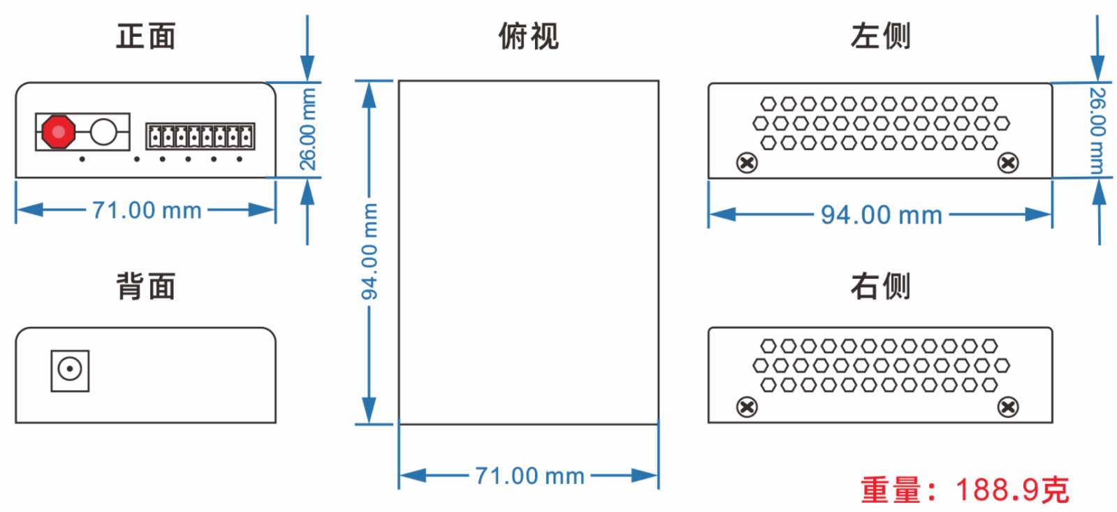 外置電源:94mm(長(zhǎng)) x 71mm(寬) x 26mm(高) 內(nèi)置電源:140(長(zhǎng))*110(寬)*30mm(高) |