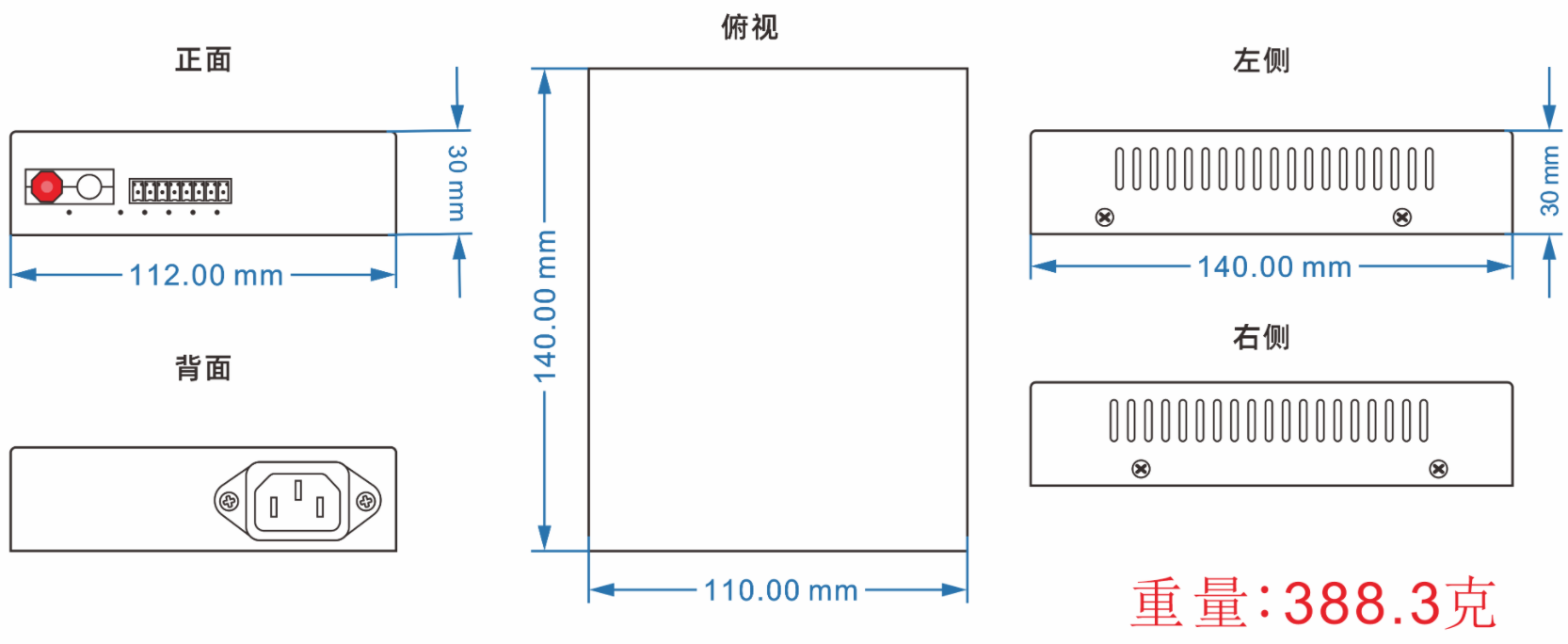 功耗<5W 外置電源:輸入DC9-12V AC內(nèi)置電源:AC~85-265V交流 DC-48V內(nèi)置電源:DC-36 ~ -72V |