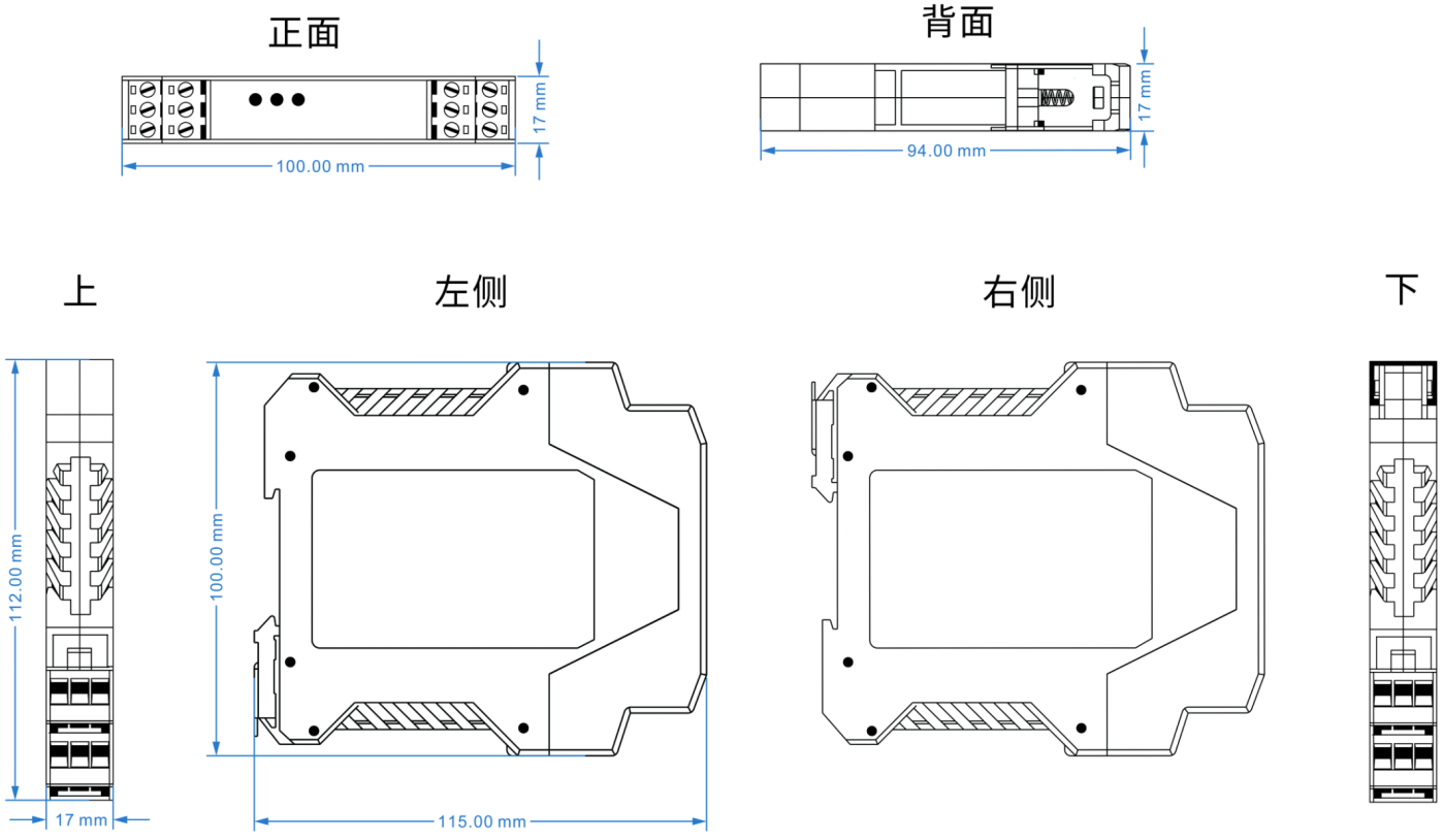 電源輸入DC9-70V ,功耗<1W 過載保護(hù):支持;反接保護(hù):支持; 接入端子:3芯5.08mm間距端子 |