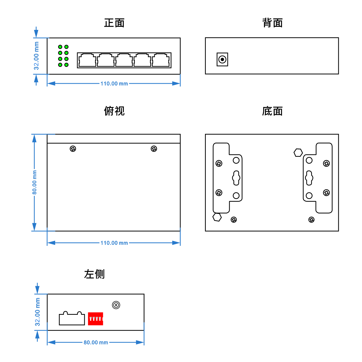 (110mm(長) x 80mm(寬) x 30mm(高) 安裝方式:導軌安裝、壁掛式安裝 |