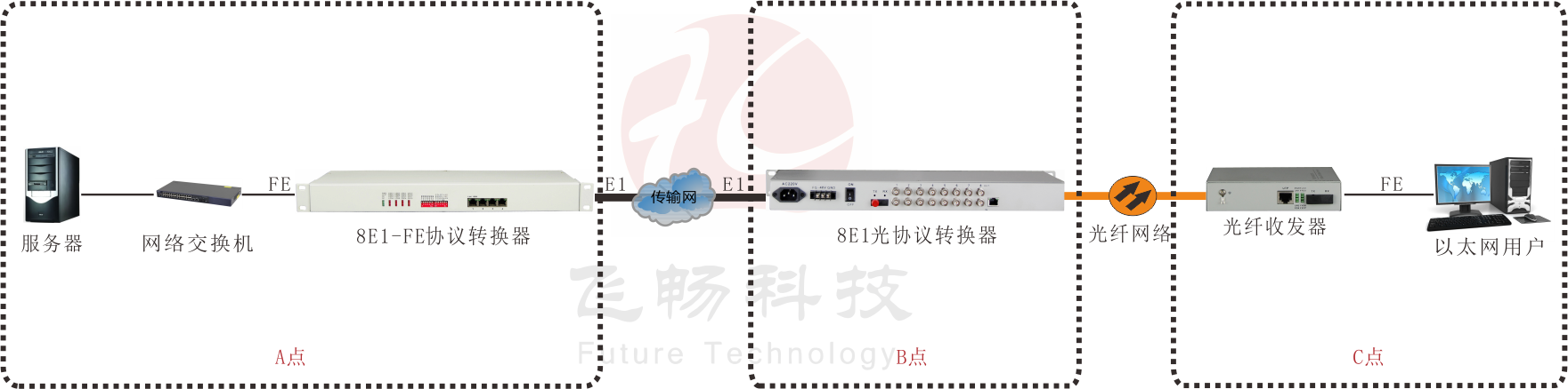 • 飛暢科技-8E1轉(zhuǎn)3路百兆電以太+1路百兆光以太 協(xié)議轉(zhuǎn)換器